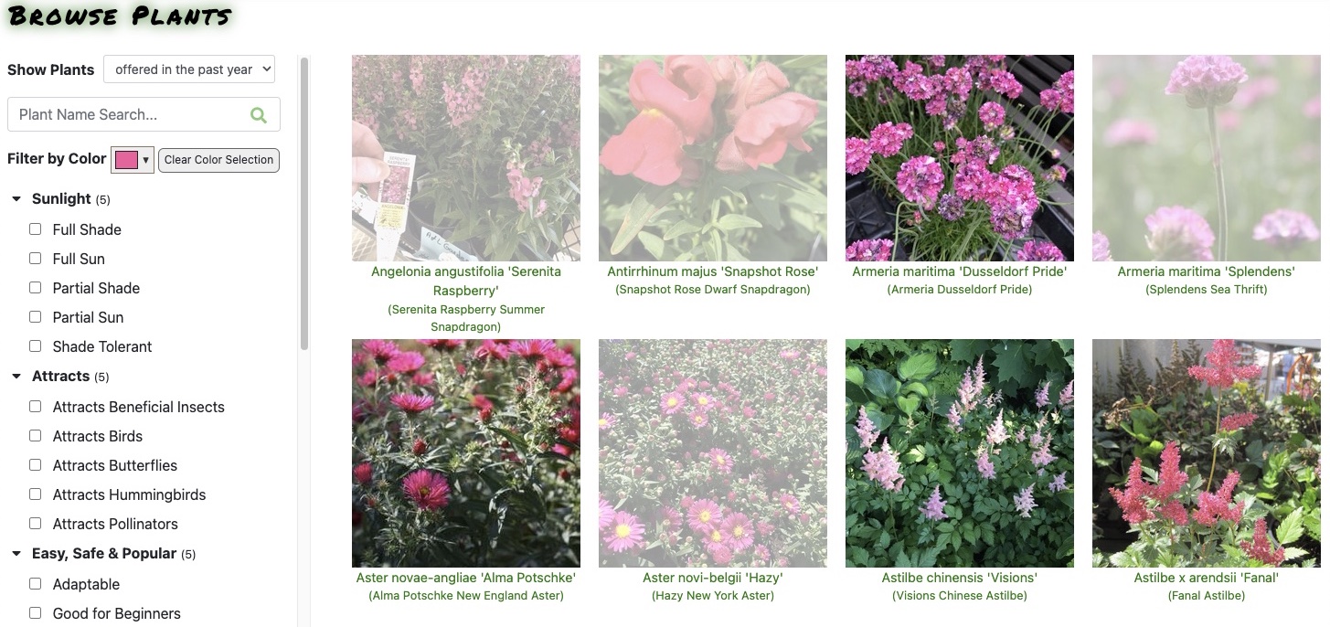 We're also always trying to find new plants we haven't had before... Here's what's new this week! Plus, we've compiled some resources to help you dream bigger: photos of inspirational landscapes, planters and hanging baskets; a plant color wheel; and a calendar of local plant events. And because the best plants are the ones that specifically work for the situation in your yard, we have a multi-criteria plant search and elevator pitches for (and against) our most popular species of perennials.