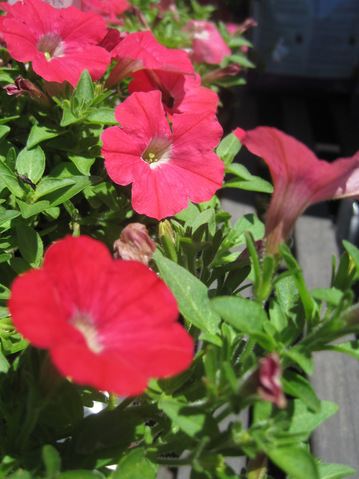 Petunias love the sun but can tolerate partial shade. They grow best in well-drained soil (planting with a handful or two of peat moss can help with this) but should be kept moist when potted, so plan on watering these beauties every few days or daily during hot weather if you have them in a planter.
