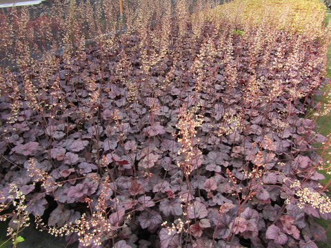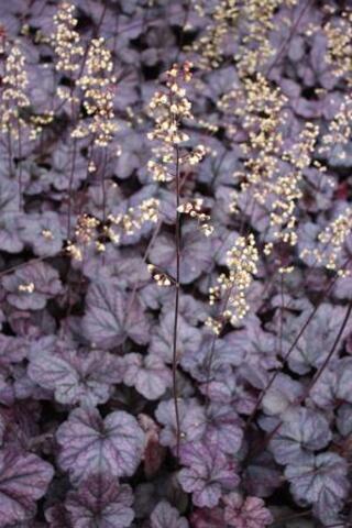 Heuchera overwinters beautifully in the ground (it could be classified as *almost* evergreen) and only needs a light trim-back in the spring to remove winter-damaged foliage. Its flowers will dry on their stalks in late summer and actually look quite pretty, in a steampunk kind of way, but you can snip the stalks and enjoy a freshened-up, foliage-only plant for the rest of the season.