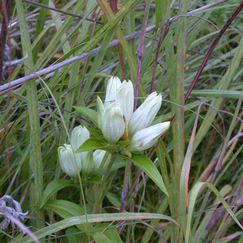 Gentiana alba, commonly known as the white gentian, is a rare and striking perennial native to eastern North America. Unlike many gentians known for their vivid blue or purple hues, this species boasts delicate, creamy white flowers that bloom in late summer to early fall. The tubular flowers arise from basal rosettes of smooth, lanceolate green leaves. White gentian typically grows 12-18 inches tall, forming compact, well-behaved clumps in the garden. It prefers cool, moist, well-drained soils and full to partial sun exposure. In the wild, Gentiana alba is found in wet meadows, prairies, and open woodland habitats. Though less common in cultivation than some of its more colorful gentian cousins, the white gentian makes an elegant addition to perennial borders, rock gardens, and woodland settings. Its understated, ivory blooms contrast beautifully with bolder companion plants. Gentiana alba also serves as an important nectar source for late-season pollinators. With its refined aesthetic and specific growing requirements, the white gentian can be a bit challenging for some gardeners. However, for those willing to provide the right conditions, it offers a unique and rewarding gentian for the perennial garden.