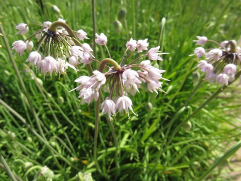 Allium species are characterized by pungent linear leaves and flowers with six petals. Many arise from bulbs or rhizomes, and most are perennials. The flowers are frequently borne in spherical flower clusters and produce black seeds in dry capsule fruits. Some plants reproduce asexually from bulbils in the flower head.
