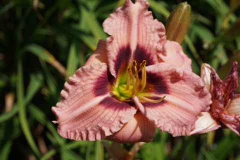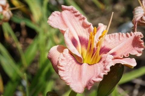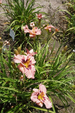 Old-fashioned orange and yellow daylilies have been hybridized to produce modern daylilies in a rainbow of colors and with flowering times from spring through summer.  Plant in full sun to partial shade in well-drained soil high in organic matter.  When planting, cover tubers in 1 inch (2.5 cm) of soil; it is not usually necessary to lift and store them for the winter.  Propagate plants by division in the fall or spring.  These plants are frequently damaged by deer but are highly salt tolerant and easy to grow.  They are excellent to plant along banks and slopes and provide a nectar source for butterflies and hummingbirds.