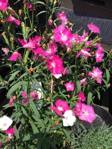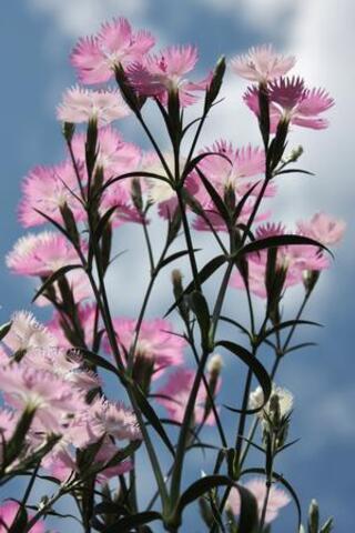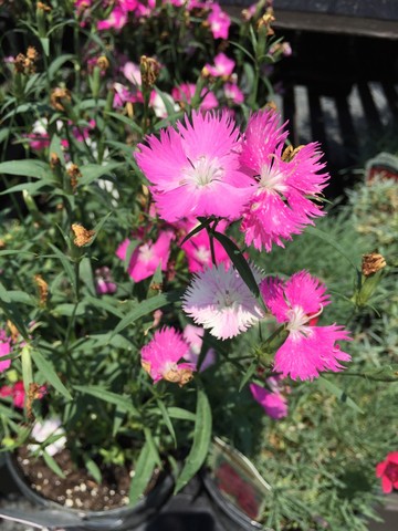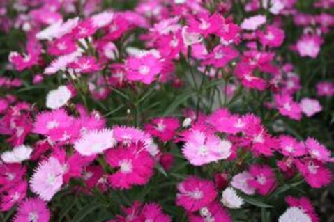 Flowers are 5-parted, fragrant, pink-lilac, pink-purple or white, often with picotee margins. The common name of 'pinks' does not refer to the color, but to the fringed or frilly edging which looks like it was trimmed with 'pinking shears'. Dianthus should be planted in full sun but can tolerate some shade. Well-drained soil and good air circulation are necessary to avoid root rot and fungal diseases. Dianthus will grow in different soil types, preferring neutral to slightly alkaline soil, but can tolerate some acidity.
