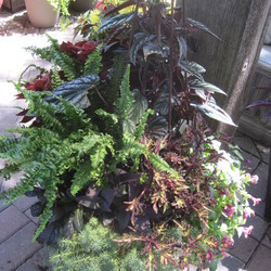 Fireworks Variegated Red Fountain Grass, ColorBlaze Wicked Witch Coleus, Superbells Pomegranate Punch, Sweet Caroline Medusa Green Sweet Potato, Chocolate Drop Coleus