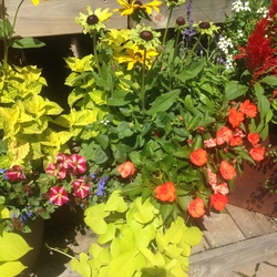Superbells Tropical Sunrise Calibrachoa, Colorblaze Sedona Sunset Coleus, Vermillionaire Firecracker Plant, Illusion Penny Lace Sweet Potato Vine, Supertunia Bermuda Beach Petunia